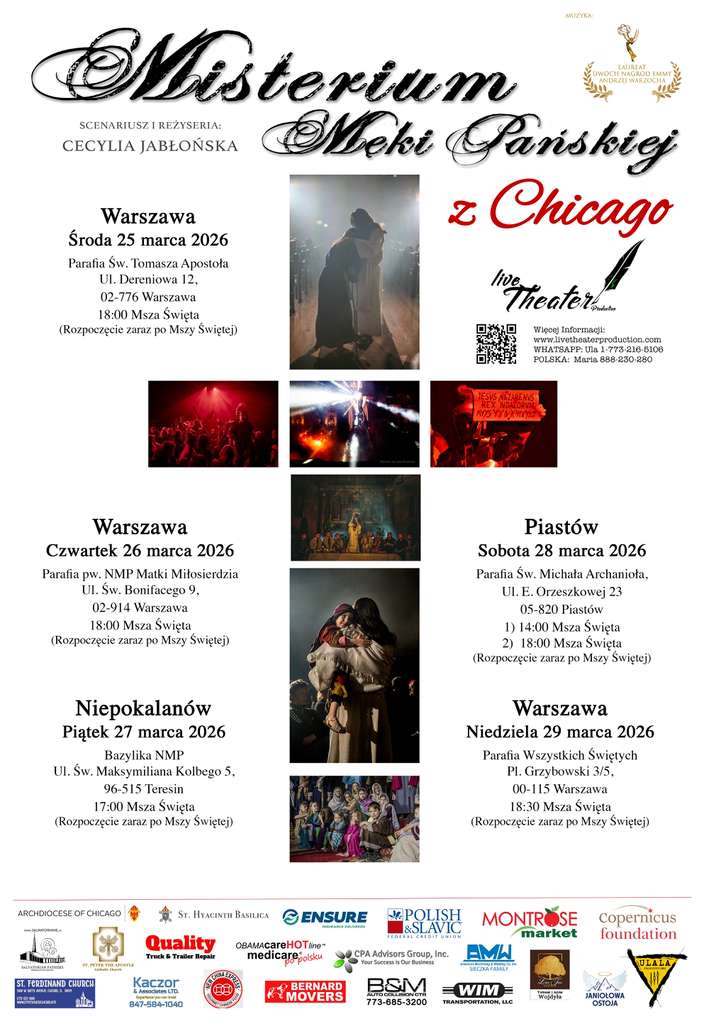 Wyjątkowe wydarzenie w Niedzielę Palmową! Będziemy gościć Live Theater Production z Chicago – wystawią w naszym kościele Misterium Męki Pańskiej. Od lat spektakl przyciąga tysiące widzów, stając się formą modlitwy i widowiskiem na wysokim poziomie artystycznym.