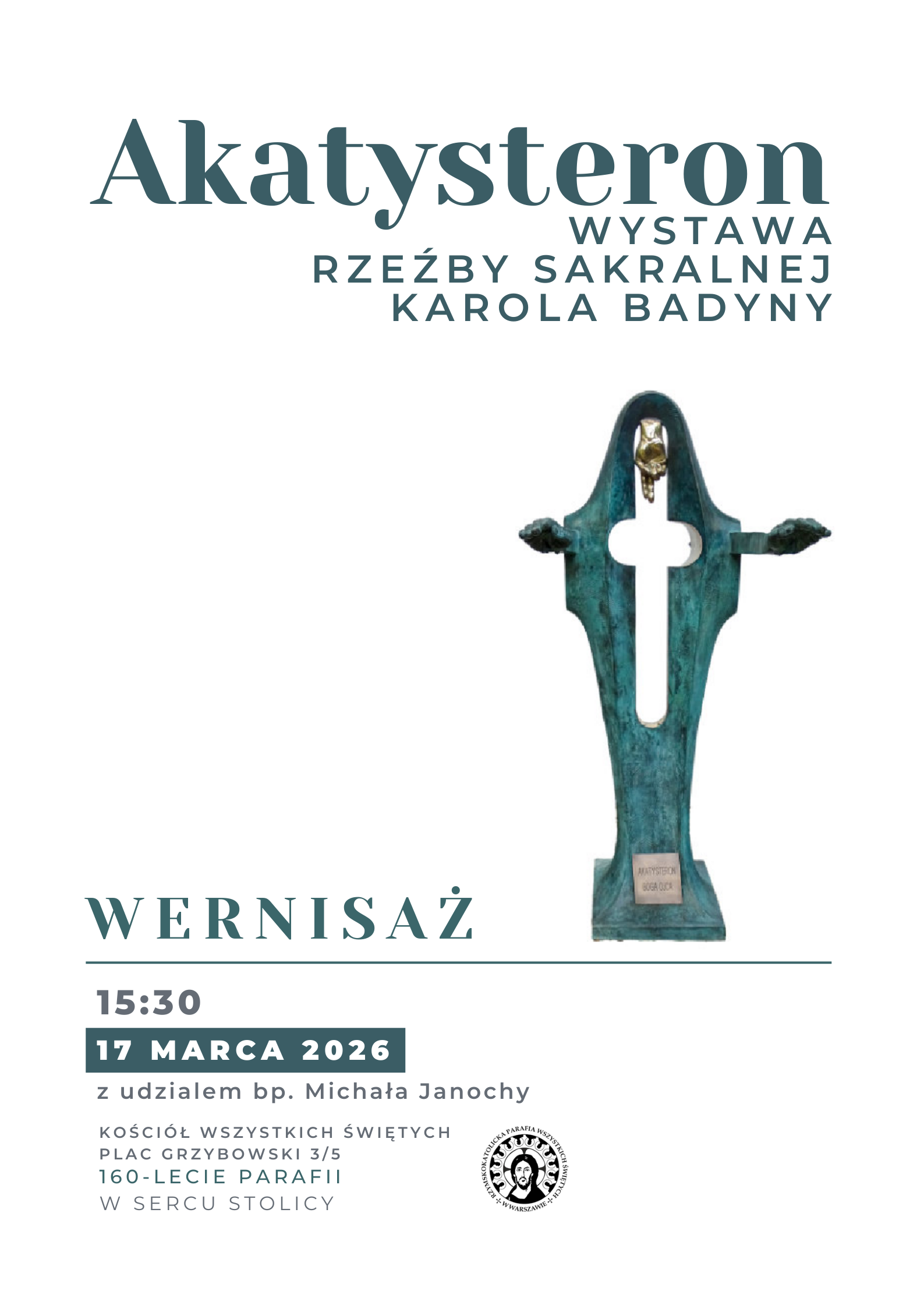 Zapraszamy na wernisaż wystawy rzeźby sakralnej pt. AKATYSTERONY autorstwa prof. Karola Badyny. Artysta wykonywał w naszym kościele anioły na wieży oraz rzeźby w ołtarzach transeptu: św. Andrzeja, św. Róży, św. s. Faustyny i bł. Michała Sopoćki.