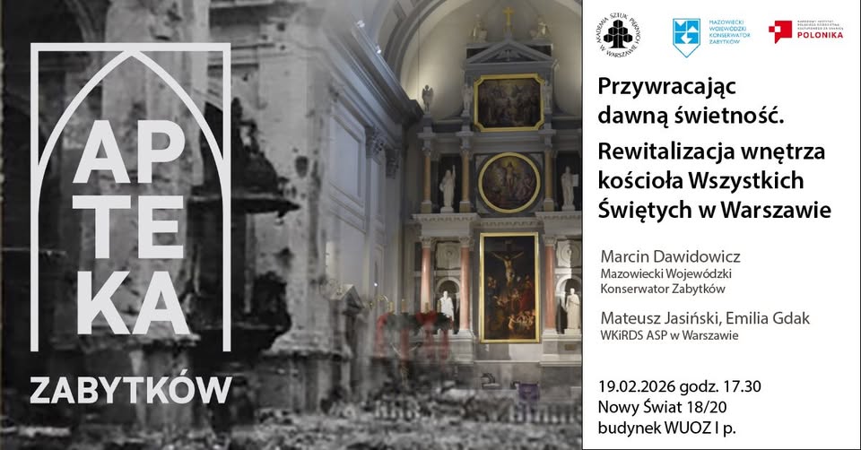 Kościół Wszystkich Świętych przy Placu Grzybowskim w Warszawie został wybudowany w 1883 roku wg projektu Henryka Marconiego. W czasie II wojny światowej, szczególnie po Powstaniu Warszawskim, w skutek bombardowań i ostrzału artylerii niemieckiej, zniszczeniu uległa większość murów świątyni i wyposażenie wnętrz. Spotkanie będzie poświęcone omówieniu zakresu prac konserwatorskich finansowanych w ostatnich latach przez Mazowieckiego Wojewódzkiego Konserwatora Zabytków oraz prezentacji wieloletniego projektu odtworzenia zniszczonych malowideł ołtarzowych z wyposażenia kościoła. Poznamy wyzwania, przed którymi stanęli konserwatorzy podejmując się odtworzenia obrazów znanych tylko z czarno-białych, przedwojennych fotografii. Dodatkowo, podczas wydarzenia zaprezentowana zostanie rekonstrukcja zniszczonego obrazu Wojciecha Gersona „Chrzest w Jordanie”, będąca aktualnie w trakcie realizacji.