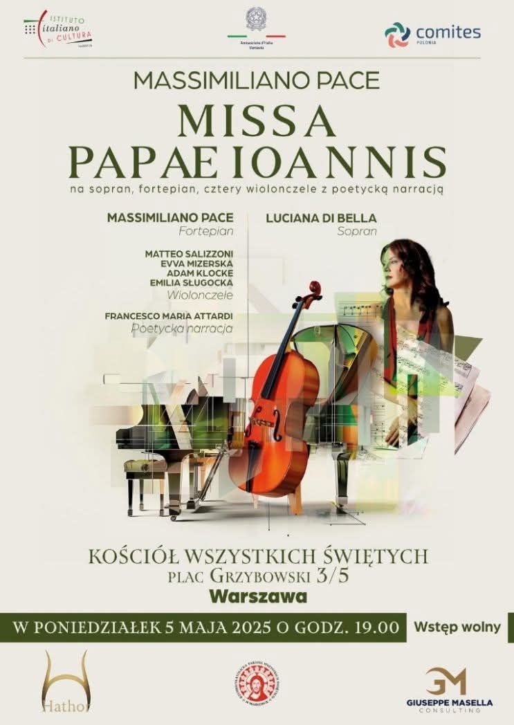 Kościół Wszystkich Świętych w Warszawie Plac Grzybowski 3/5, Warszawa, mazowieckie, PolandZapraszamy na niezwykły koncert organizowany przez Włoski Instytut Kultury. Zostanie wykonana Missa Papae Ioannis, utwór rzymskiego kompozytora i pianisty Massimiliana Pace. Kompozycja, stworzona na sopran, fortepian, cztery wiolonczele i poetycką narrację, zostanie wykonana m. in. przez samego kompozytora, który zagra na fortepianie. Missa Papae Ioannis została pierwotnie zamówiona z okazji dziesiątej rocznicy kanonizacji papieża Jana… Czytaj dalej »koncert Missa Papae Ioannis