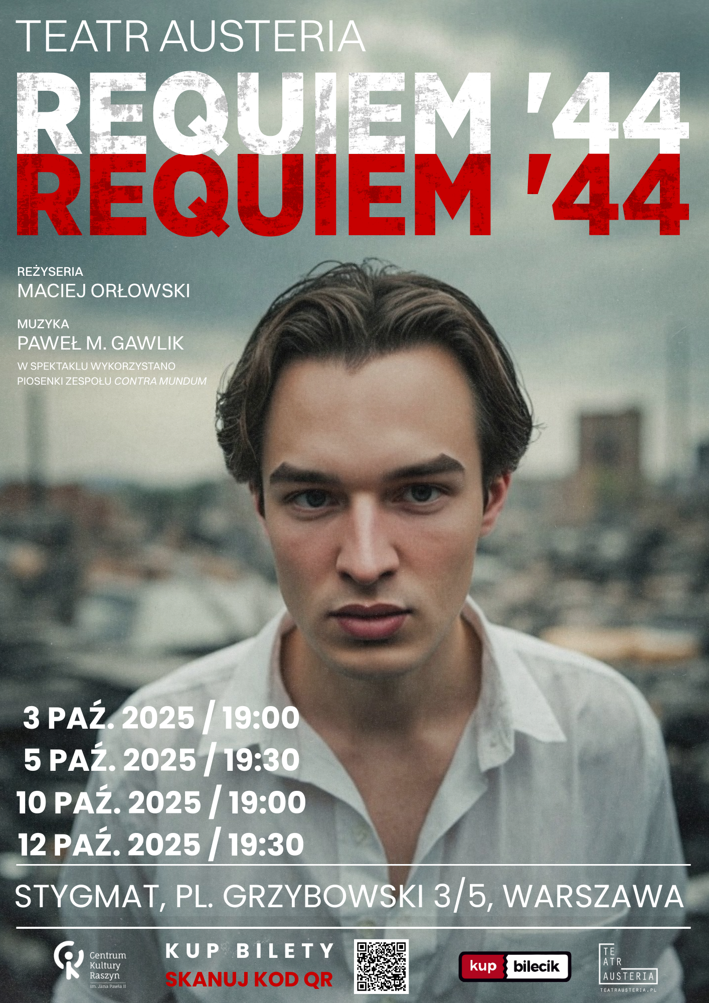 Scena Stygmat - sala widowiskowa w podziemiach kościoła Wszystkich Świętych Plac Grzybowski 3/5, Warszawa, PolandZapraszamy na wyjątkowy spektakl w reżyserii Macieja Orłowskiego, o cywilach Powstania, ich walce o przetrwanie, szaleństwie i nadziei, która jest silniejsza od śmierci... Wzruszająca muzyka Pawła M. Gawlika i pieśni zespołu Contra Mundum do słów poetów Powstania Warszawskiego... TERMINY: 3 października 2025 - godz. 19:00 5 października 2025 - godz. 19:30 10 października 2025 -… Czytaj dalej »[spektakl] Requiem 44 – Gloria victis | reż. Maciej Orłowski